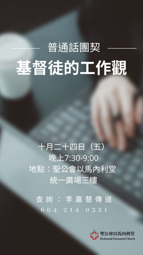 Mandarin Fellowship — Christian Perspectives on Work 普通話團契– 基督徒的工作觀 Date: 24 October (Fri) Time: 7:30pm–9:04pm (Mandarin) 地點: 聖公會以馬內利堂 列治文統一廣場三樓 Richmond Emmanuel Church #3380, 8181 Cambie Road,#3380, Richmond查詢:李嘉慧傳道 電話:604 214 032 Mandarin, Promotion, 普通話團契